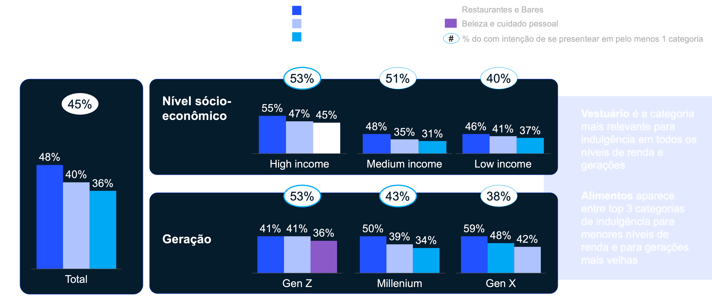 Ainda que este índice tenha caído 10 p.p. em relação ao ano passado, 45% dos brasileiros mantêm o hábito de “se presentear” e passaram a incorporar à lista de indulgências categorias de consumo de curto prazo, como supermercados e comida em casa.