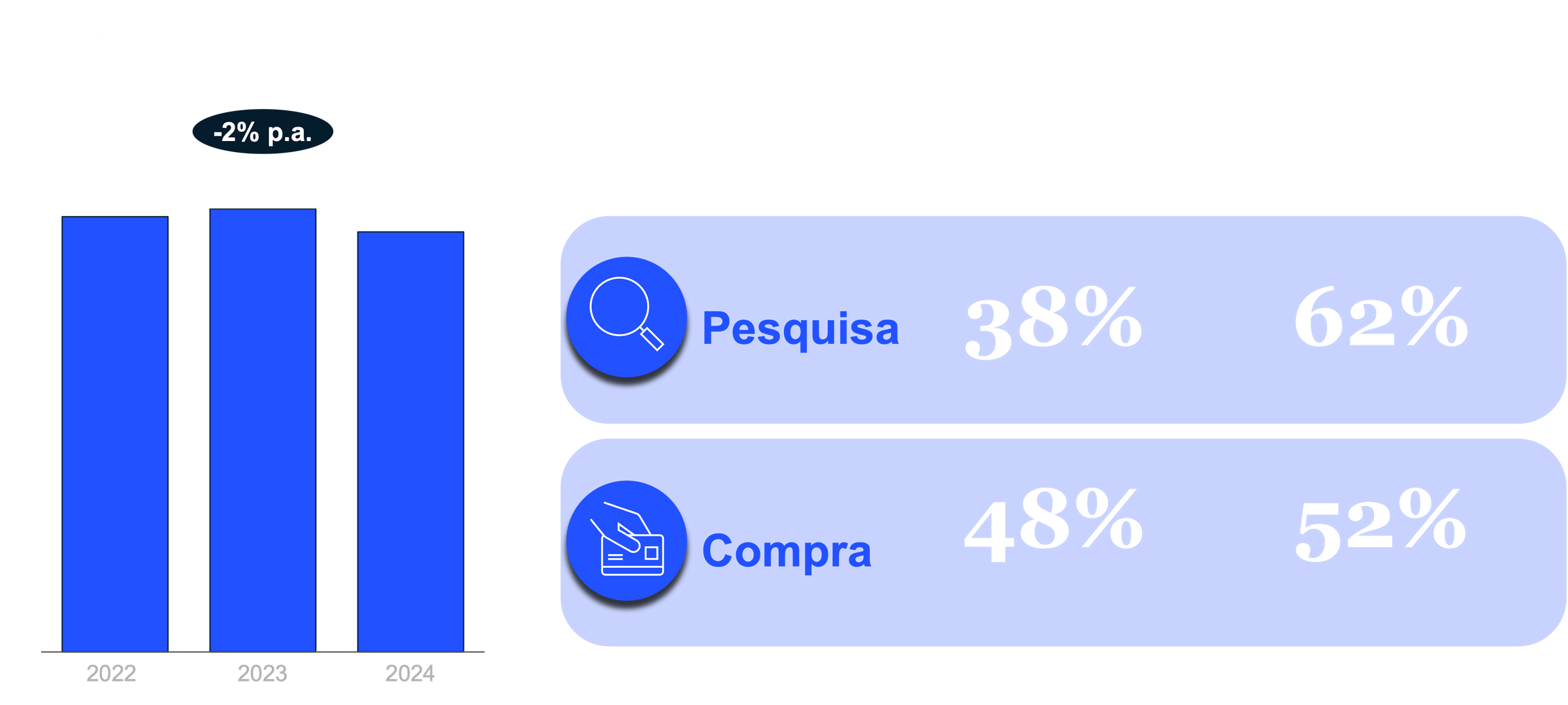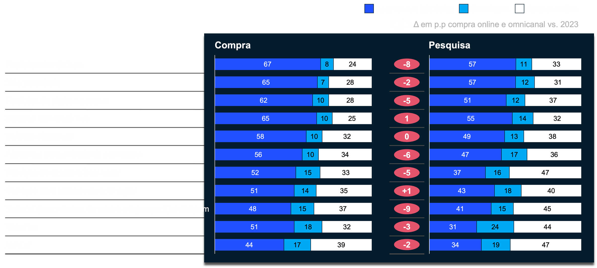 Gráfico da direita considera todas as 35 categorias investigadas em 2023. Pergunta: “Qual opção melhor descreve como você comprou/pesquisou as categorias a seguir nos últimos 3 meses?”