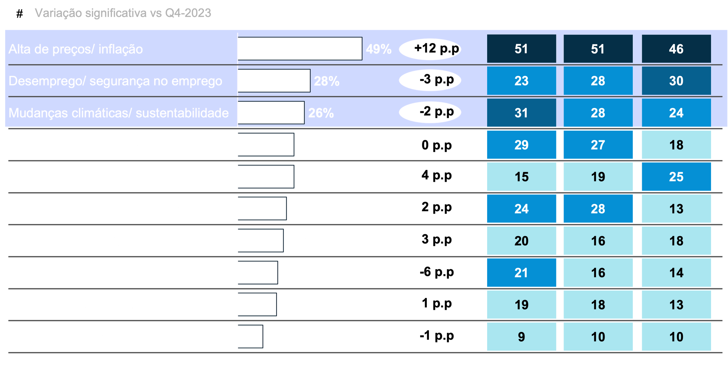 % de respondentes que selecionaram o fator como as 3 principais fontes de preocupação